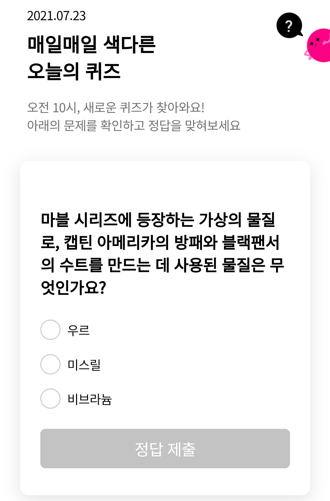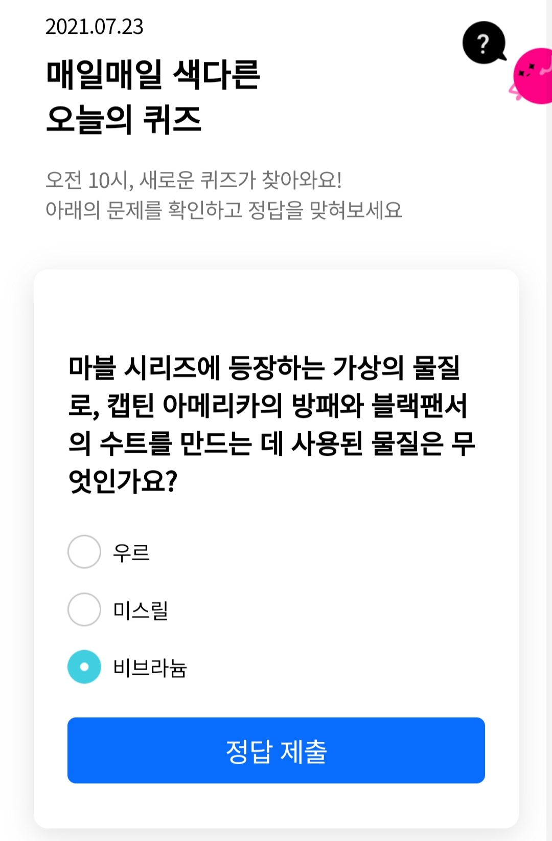 마블시리즈에 등장하는 가상물질로 캡틴아메리카의 방패와 블랙팬서 수트를 만드는데 사용된 물질은?