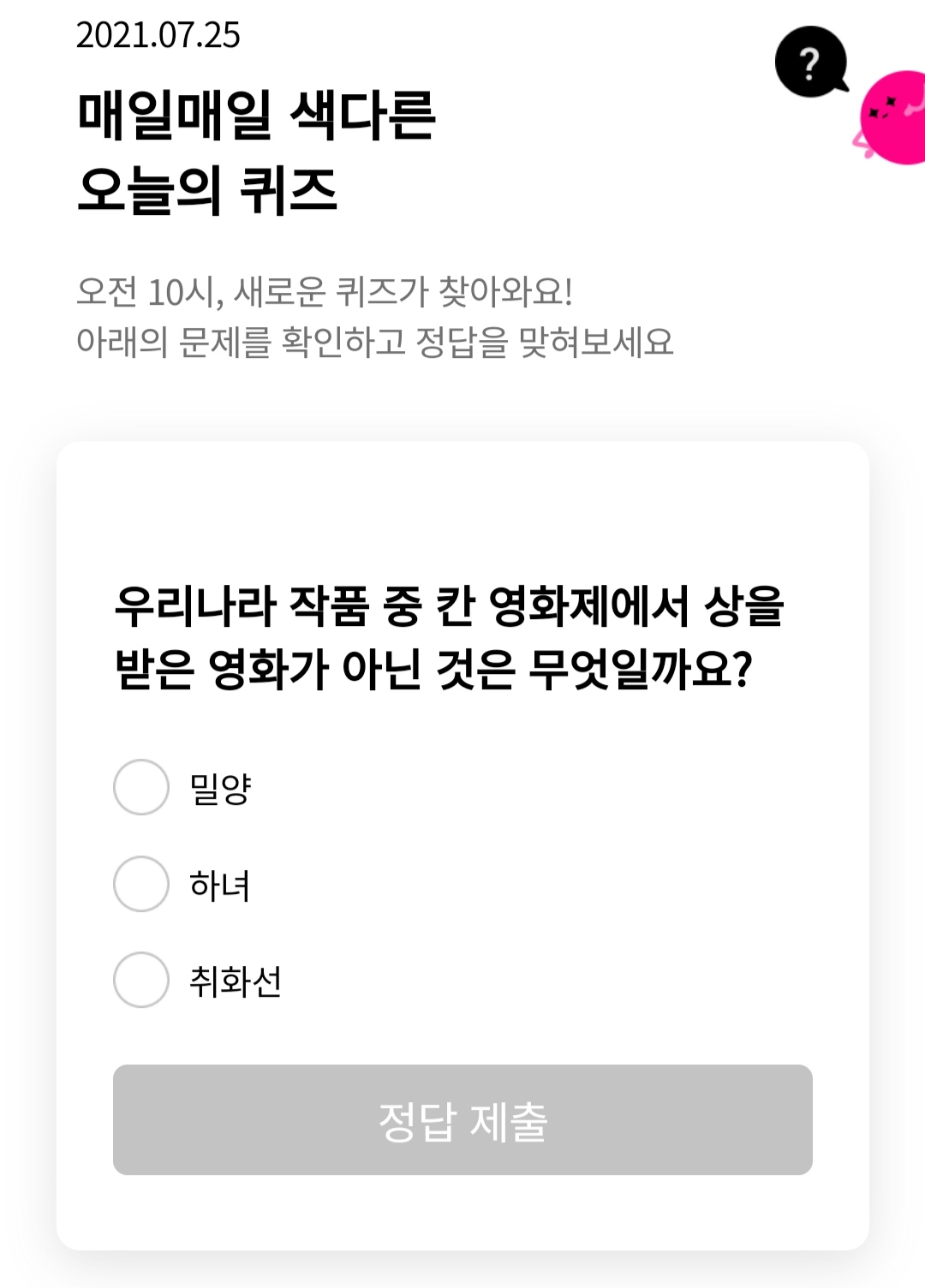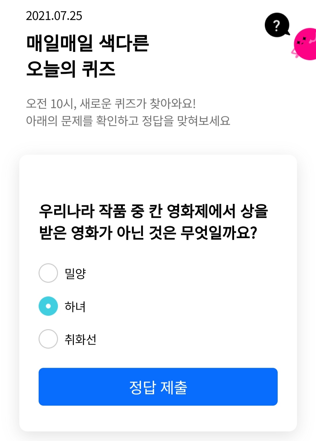 | 리브메이트-오늘의퀴즈(2021.7.23) (0) | 2021.07.23 |