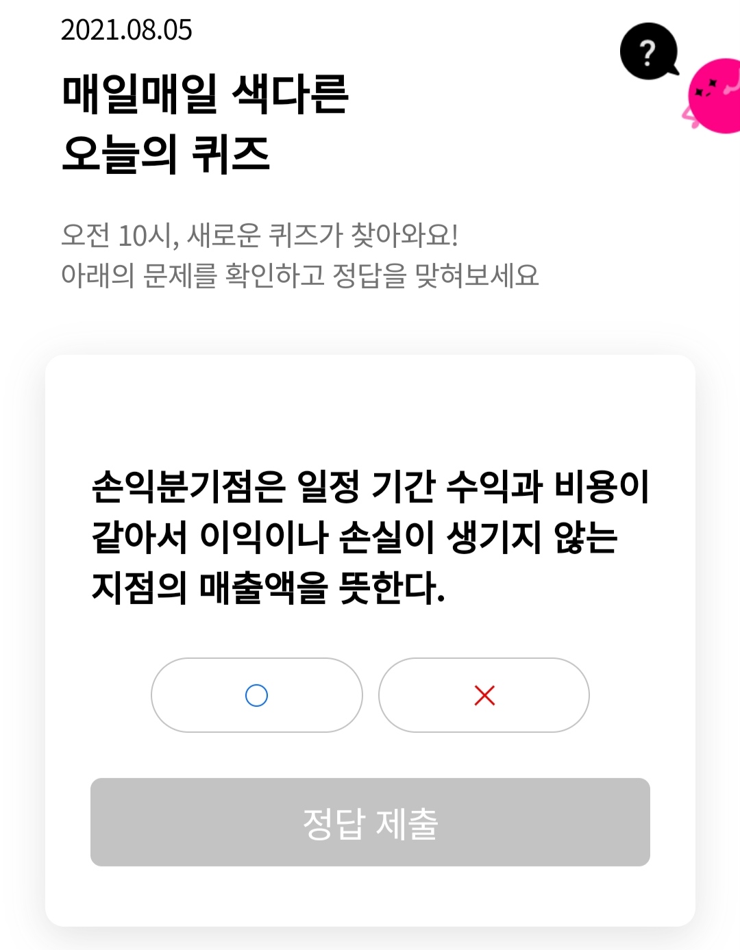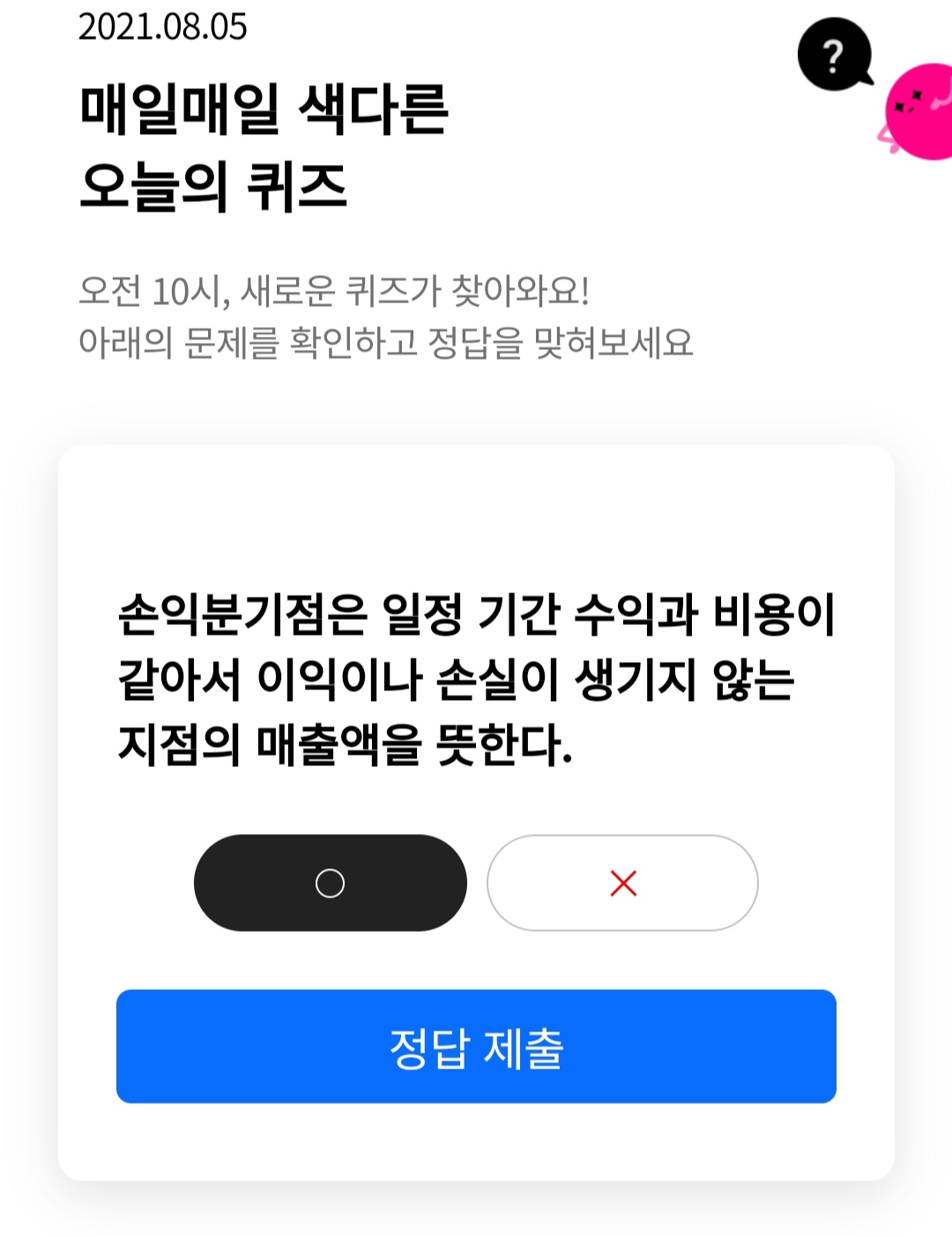 손익분기점은 일정기간 수익과비용이 같아서 이익이나 손실이 생기지 않는 지점의 매출액을 뜻한다..?
