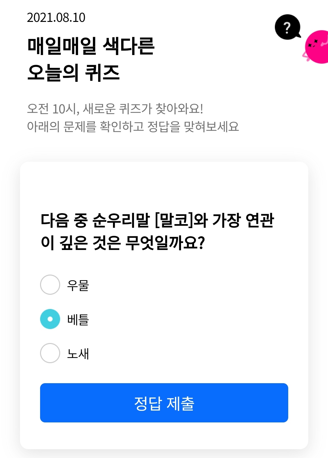 | 리브메이트-오늘의퀴즈(2021.8.11) (0) | 2021.08.11 |