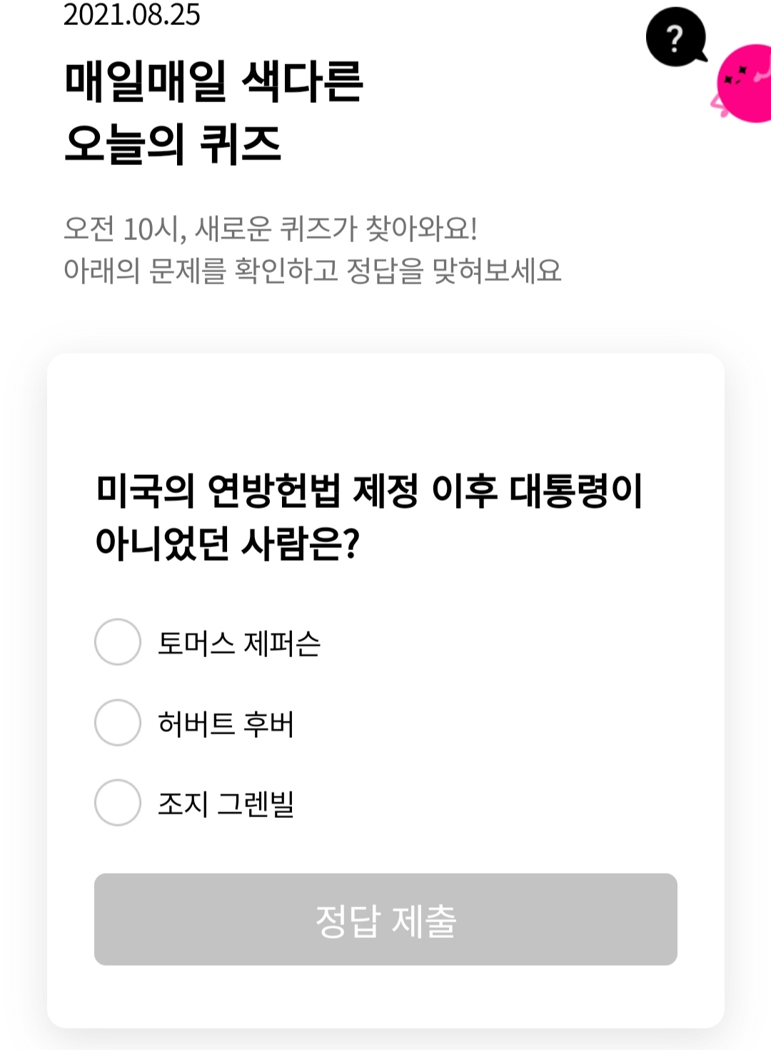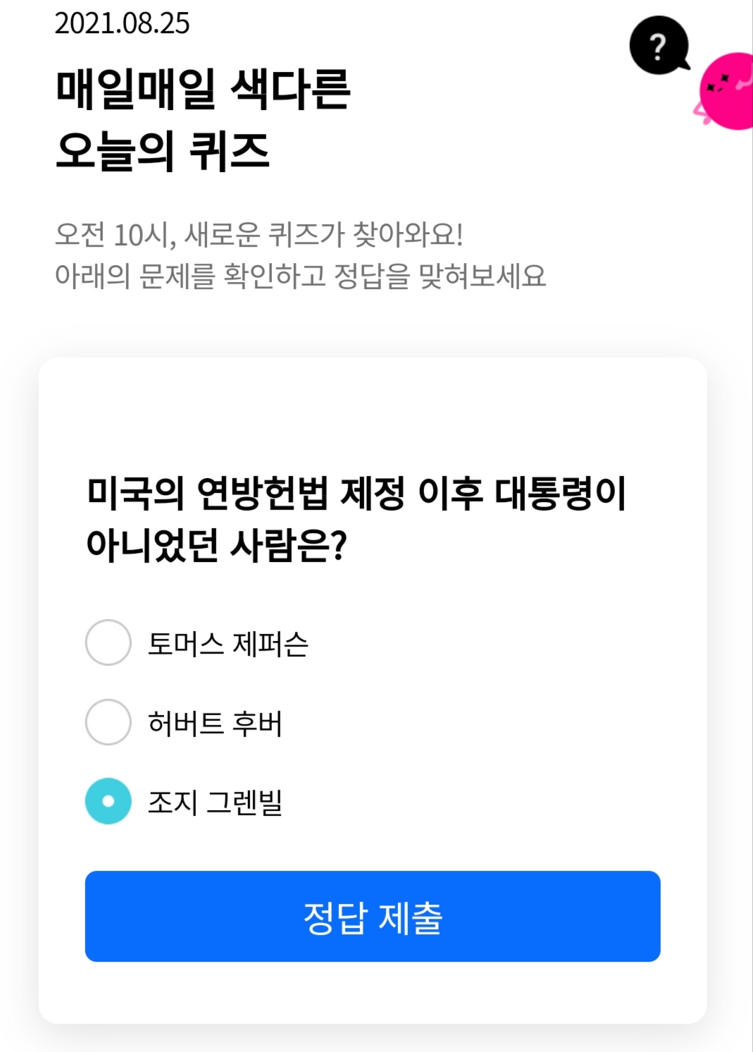 | 리브메이트-오늘의퀴즈(2021.8.21) (0) | 2021.08.21 |