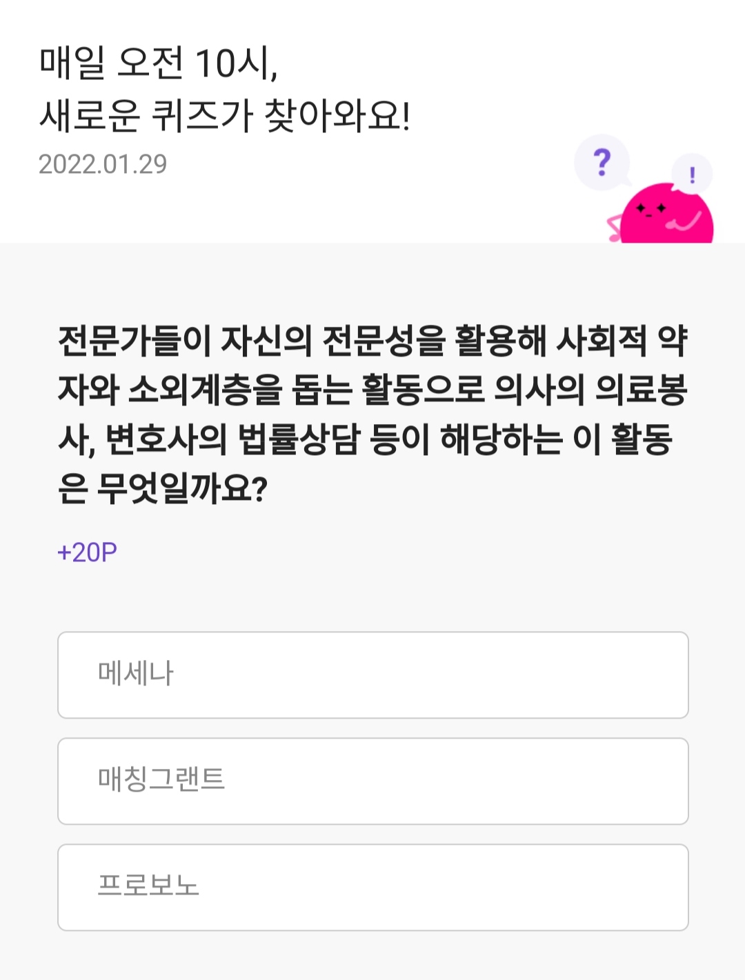 전문가들이 자신의 전문성을 활용해 사회적 약자와 소외계층을 돕는 활동으로 의사의 의료봉사,변호사의 법률상담등이 해당하는 이활동은 무엇일까요?