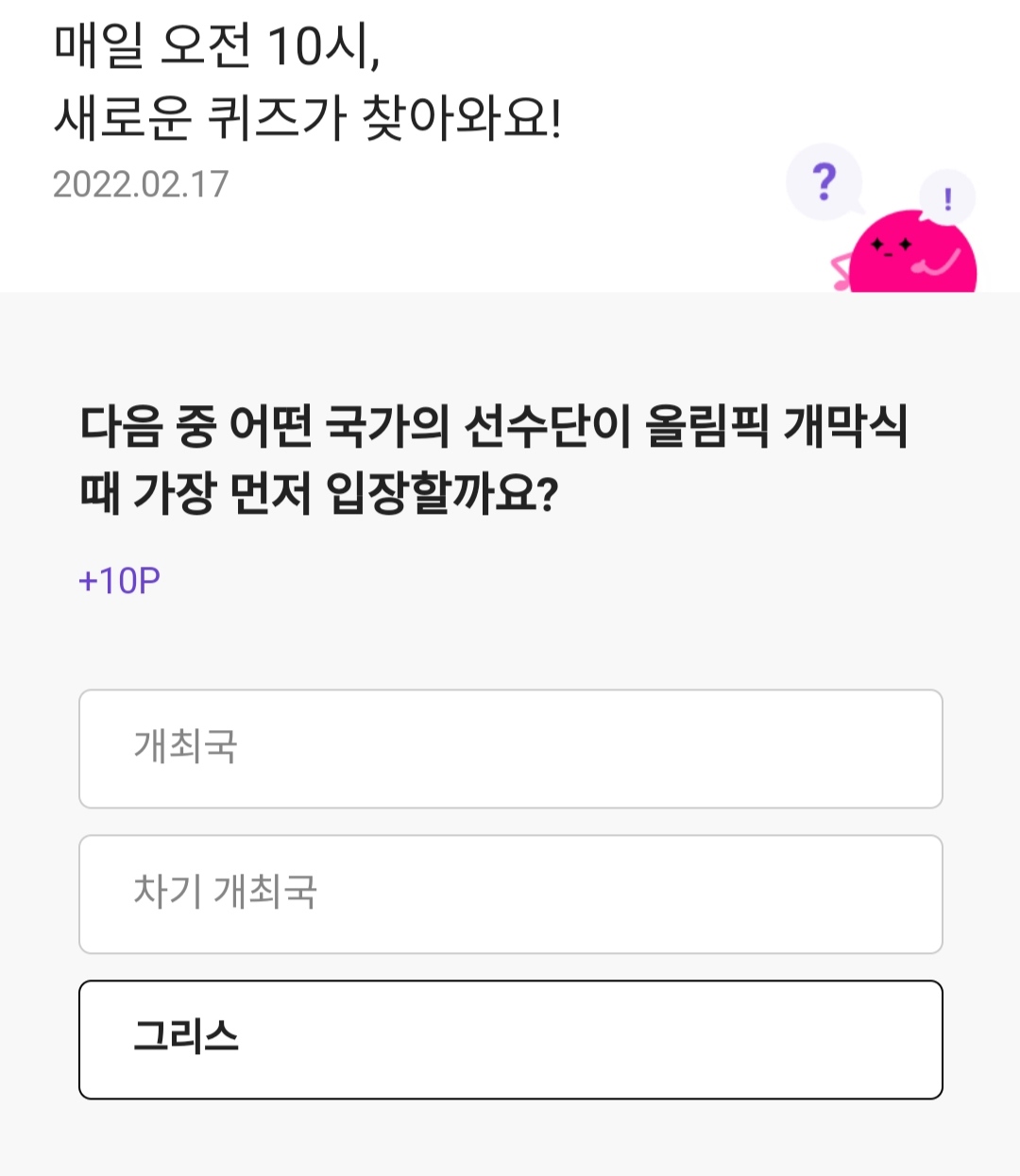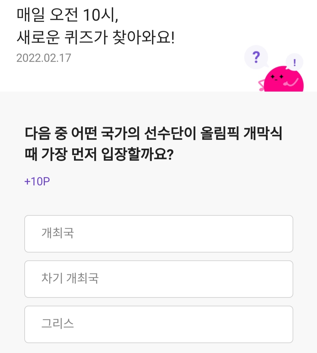 | 오늘의퀴즈 투게더를 통해 친구를초대해 함께 오늘의퀴즈를 풀면 최대 50000포인트리를 받을수있다. (0) | 2022.02.18 |
