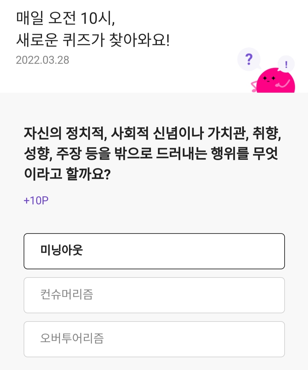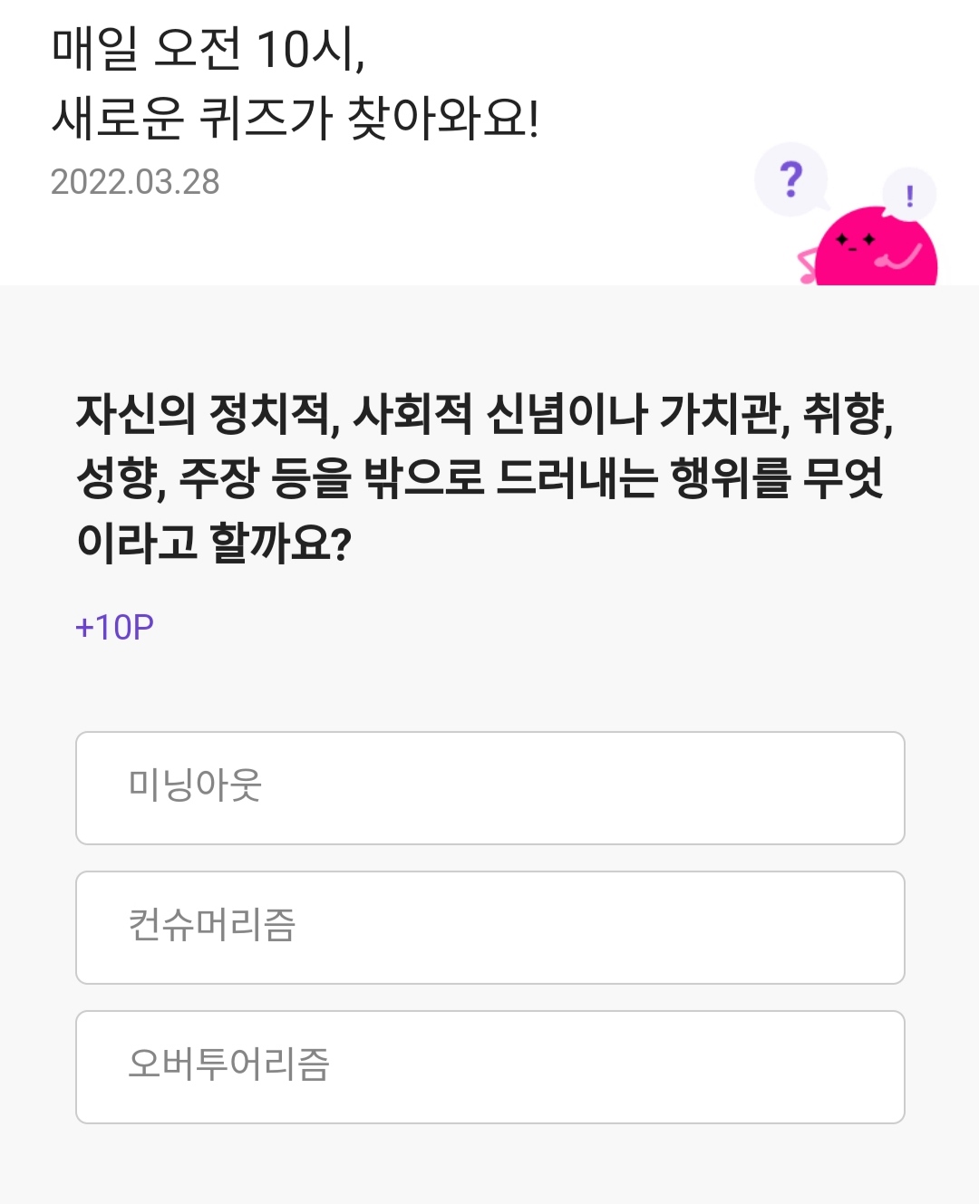 자신의 정치적 사회적 신념이나 가치관 취향 성향 주장등을 밖으로 드러내는 행위를 무엇이라고할까요?
